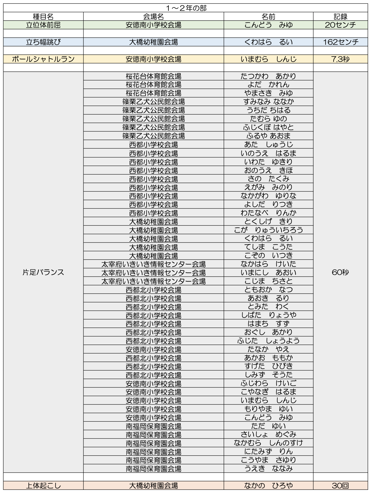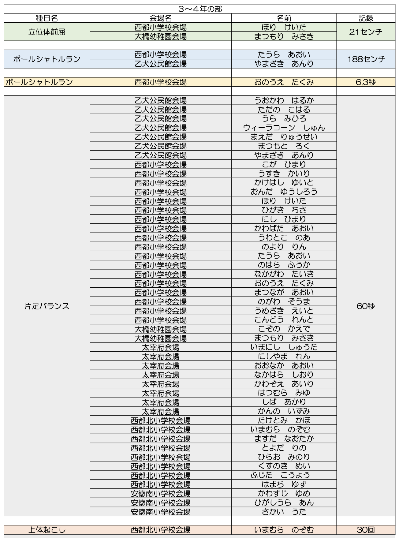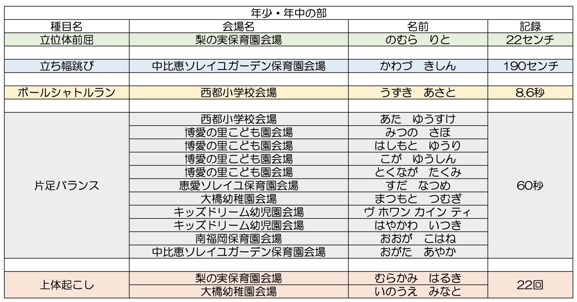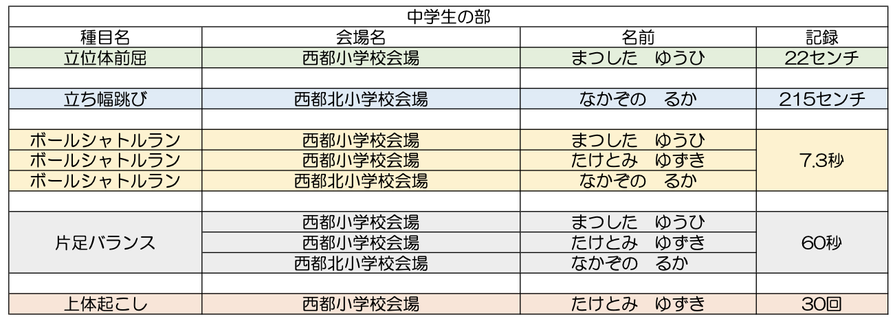2025年度運動能力テスト1位発表 お知らせ 2025.12.09 リノラスポーツです! 今年も運動能力テストの1位の発表を行います! 記載されている方は、順次賞状をお渡ししますのでお楽しみに! 学年別で 年少・年中の部 年長の部 1〜2年の部 3〜4年の部 5〜6年の部 中学生の部 にて各種目の1位の人を掲載しております。 それでは発表です! 以上となります! 受賞された方はおめでとうございます!